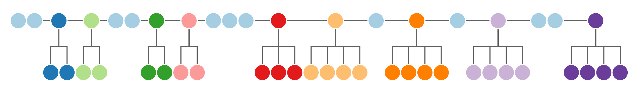 Along the x axis, the relation between root and subtree group is flatten. The relation among subtrees within subtree group is juxtapose.