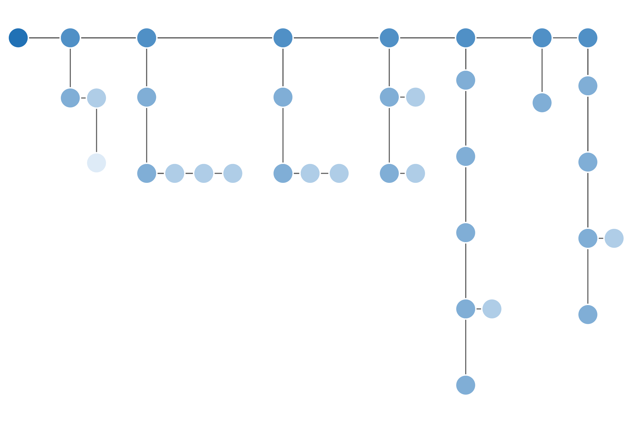 Along the x axis, the relation between root and subtree group is juxtapose. The relation among subtrees within subtree group is flatten.